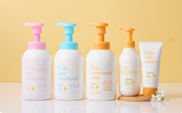 <写真左から>ママ&キッズ キッズリンスインヘアシャンプー 460ml 1,991円(税込)、ママ&キッズ キッズへアシャンプー 460ml 1,958 円(税込)、ママ&キッズ キッズモイストボディホイップ 460ml 1,958 円(税込)、ママ&キッズ キッズミルキーローション 200ml 2,310 円(税込)、ママ&キッズ キッズミルキークリーム 90g 2,310 円(税込